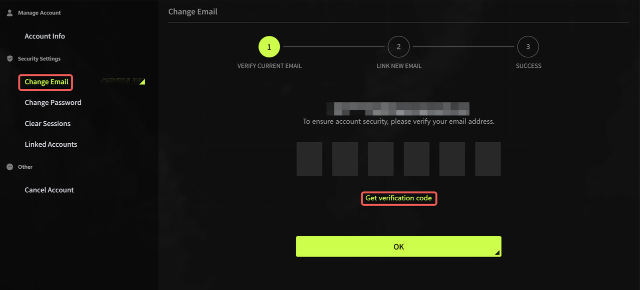 2. Click [Change Email] > [Get verification code]. The code will be sent to your currently linked email.