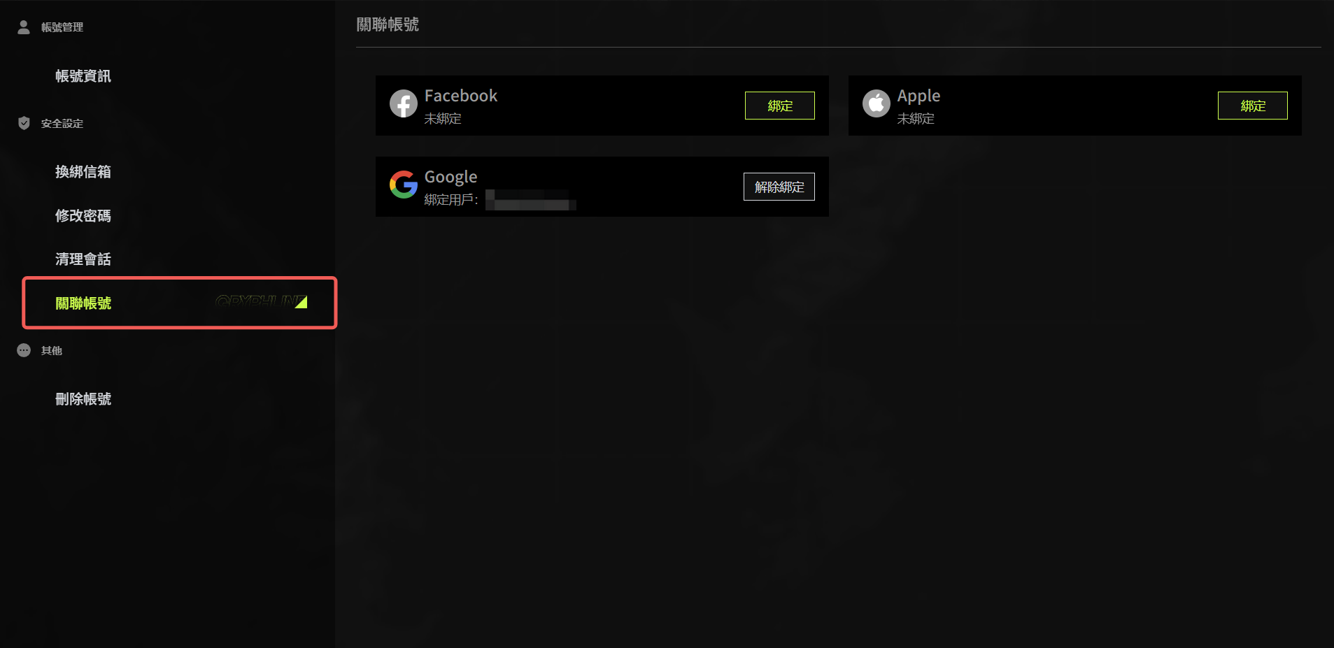 3. 點選【關聯帳號】,選擇您想要解綁的第三方帳號,點選【解除綁定】-【取得驗證碼】,驗證碼將被傳送至您目前所綁定的電子信箱。